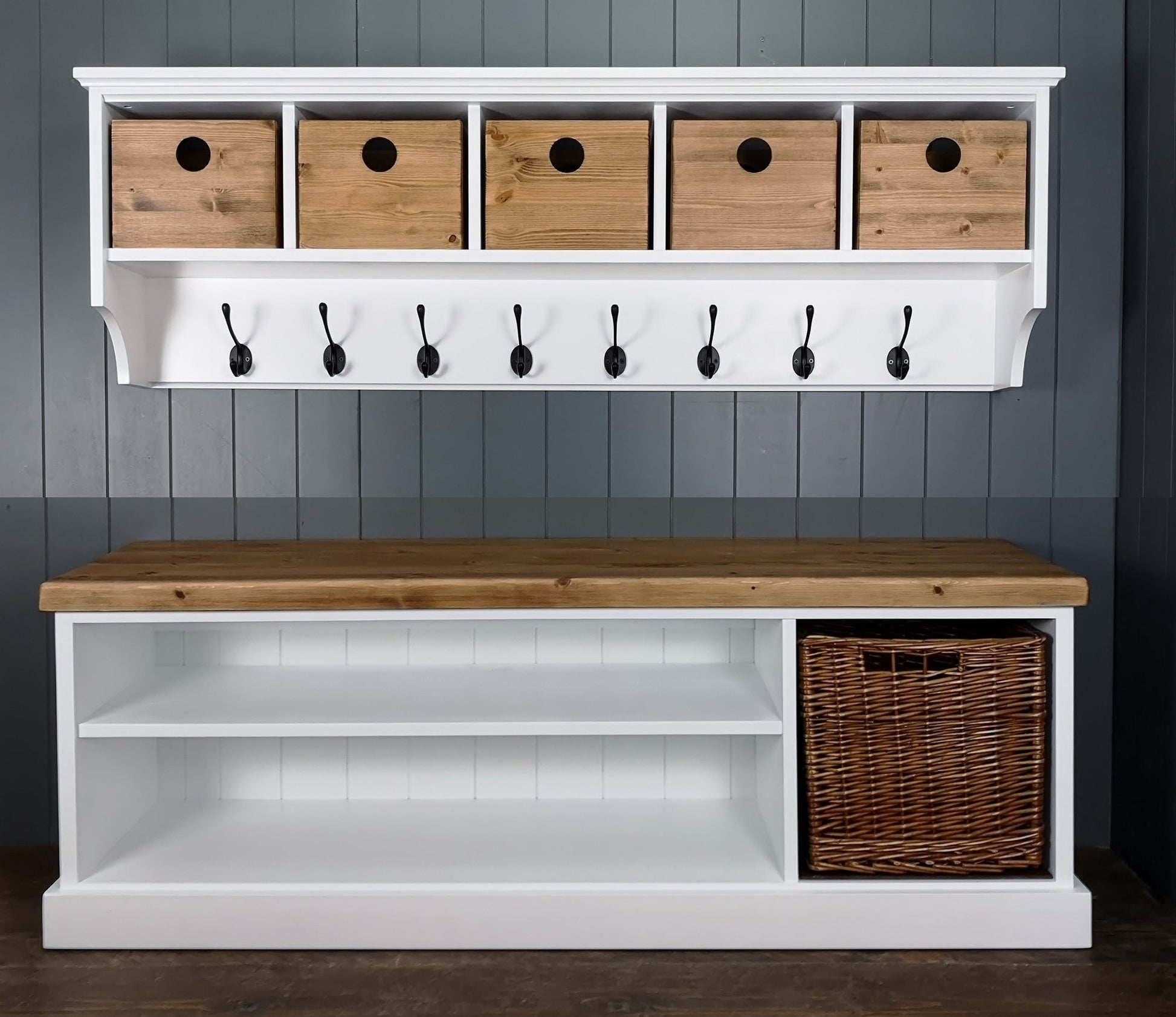 This beautiful hallway set is made in solid wood in the UK. It is an eye catching addition to any hallway, boot room, entryway or cloakroom.